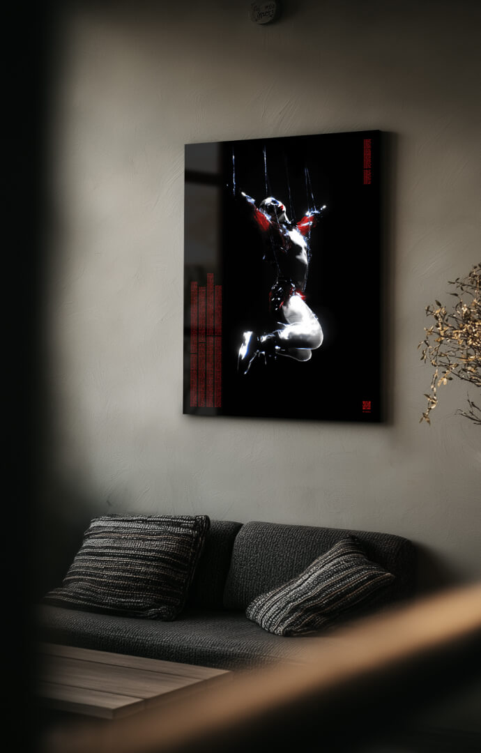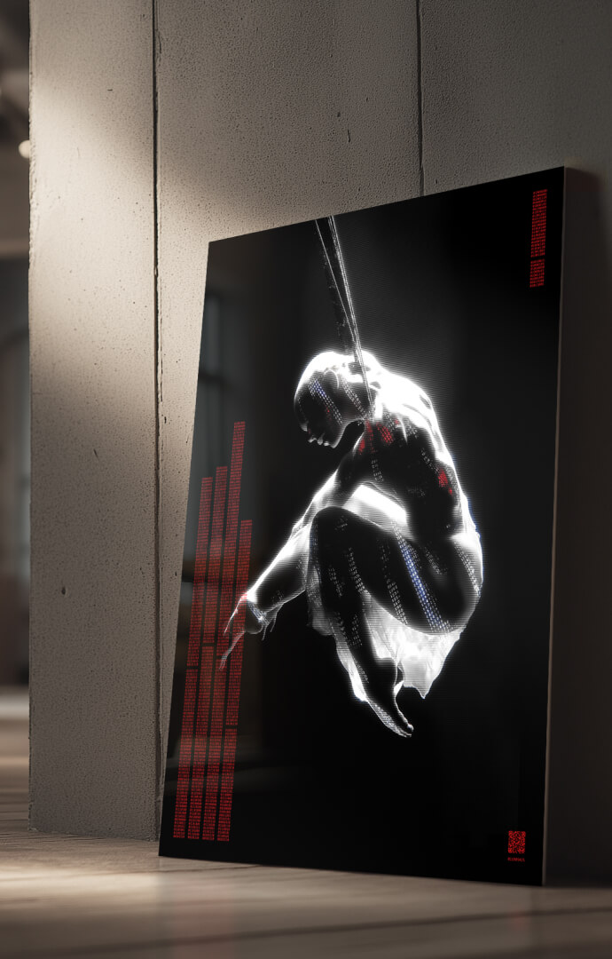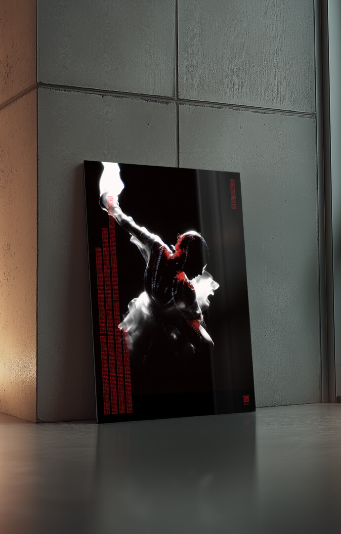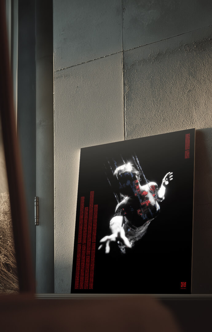 Dance with the Devil reflektiert das Menschsein im Zeitalter technologischer Steuerbarkeit. Körper im Widerstand – eingespannt zwischen Kontrolle und Aufbegehren, überlagert von Säulen aus Binärcode.