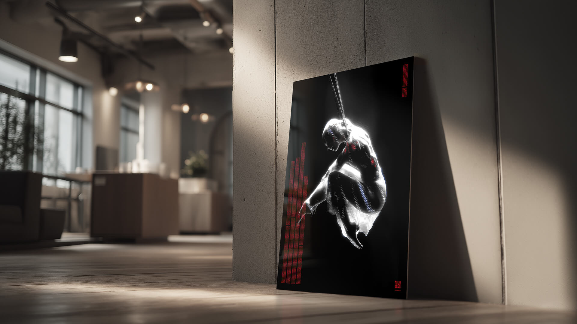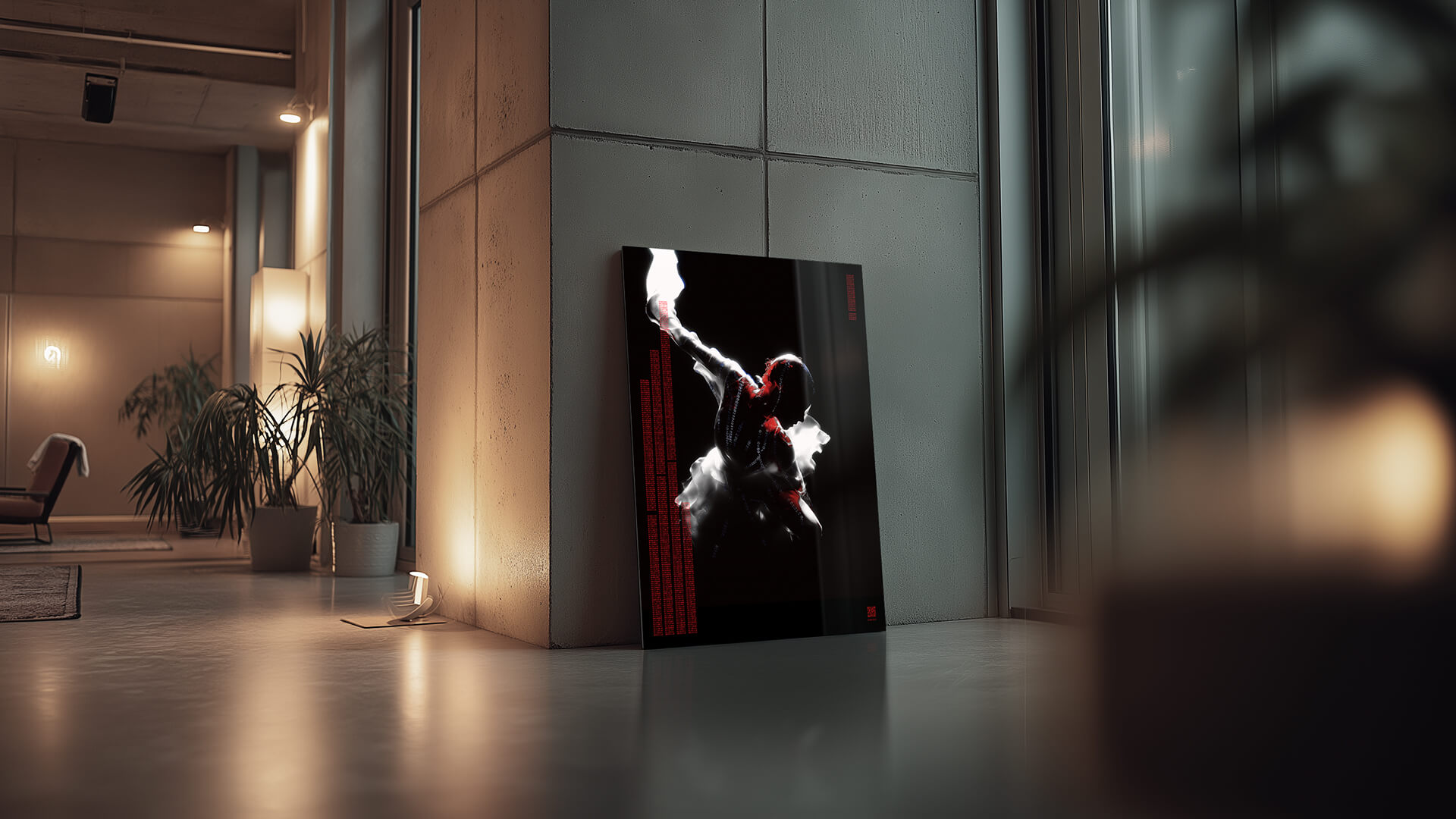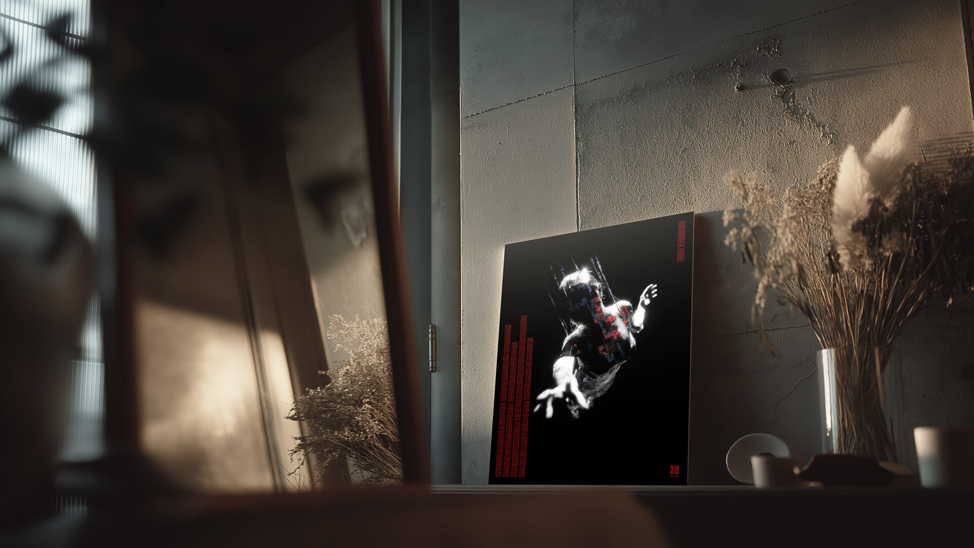 Dance with the Devil reflektiert das Menschsein im Zeitalter technologischer Steuerbarkeit. Körper im Widerstand – eingespannt zwischen Kontrolle und Aufbegehren, überlagert von Säulen aus Binärcode.